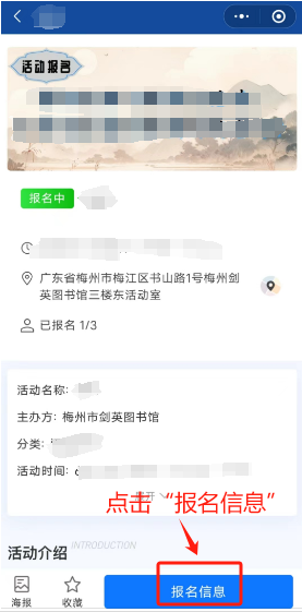 报名后如无法参加,请及时扫码进入或在“数阅梅州”小程序“活动抢先看”栏目找到此活动,按如下流程取消报名。