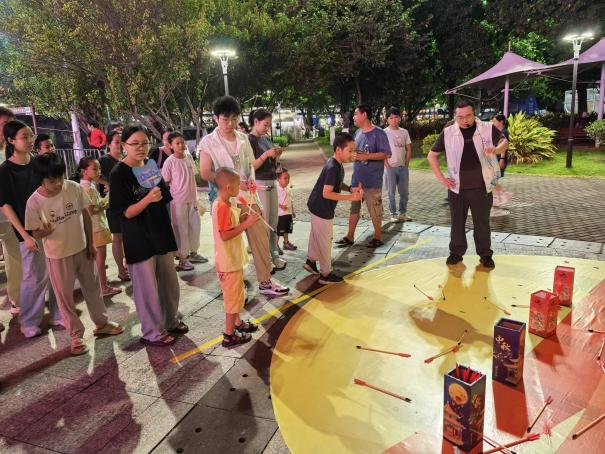 投壶区吸引了不少人一试身手,参与者们手持羽箭,凝神定气,瞄准壶口轻掷而出。每当箭支落壶,周围便响起一片叫好。不论男女老少,个个神情专注,每一次投掷都引来阵阵鼓励与掌声。传统游戏不仅让大家体验了古人的宴饮之乐,更在轻松互动中寄寓了团圆安康的美好心愿,欢声不断,雅趣盎然。